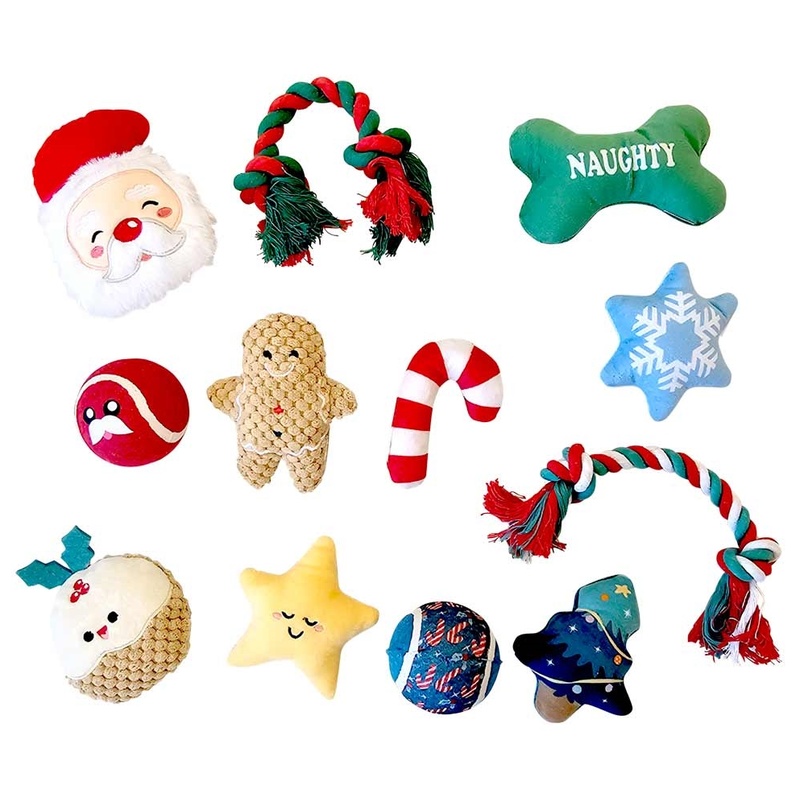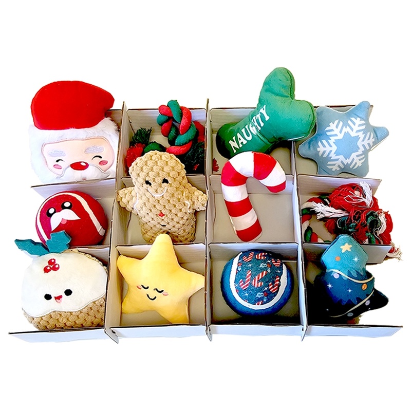 Vánoční dárkový box obsahuje 12 pečlivě vybraných malých hraček pro psy: 2 tenisové míčky, 2 přetahovadla s uzly a 8 pískacích plyšových hraček (stromeček, Santa, perníček, muffin, kost, hvězda, vločka a lízátková hůlka), z nichž 1 navíc šustí. Perfektní dárek, který potěší každého hravého psa.