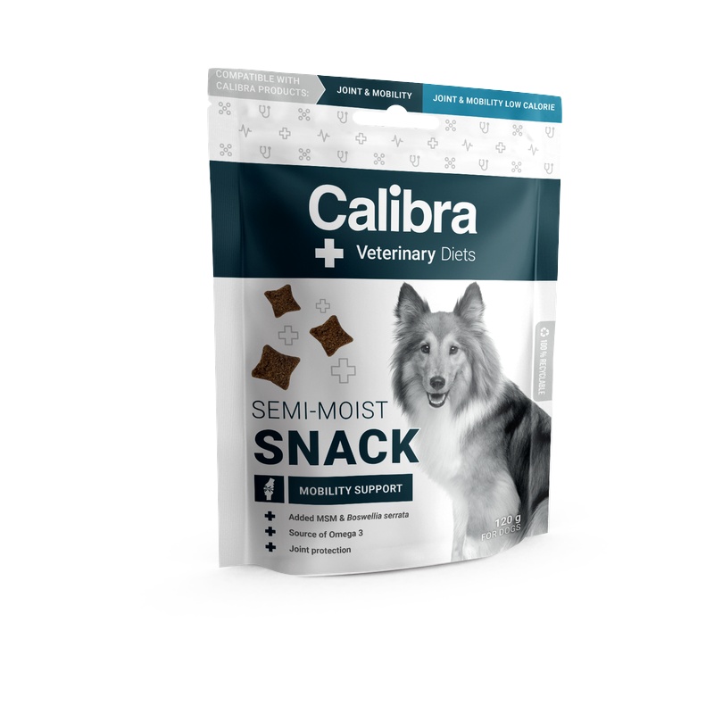 Receptura Mobility Support Semi-moist Snack je kompatibilní také s veterinární dietou Calibra VD Dog Joint & Mobility a Calibra VD Dog Joint & Mobility Low Calorie.