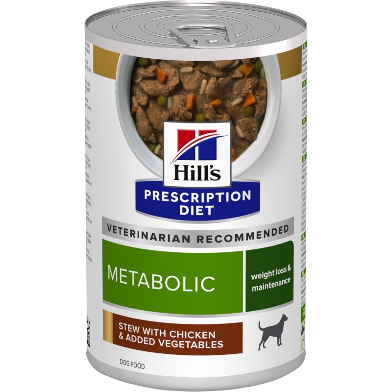 Hill’s Prescription Diet Metabolic Weight Loss & Maintenance ochucené kuřetem a zeleninou je kompletní vlhké dietetické krmivo s nízkým obsahem energie, které napomáhá snížení nadměrné tělesné hmotnosti a udržení zdravé tělesné hmotnosti dospělých psů.