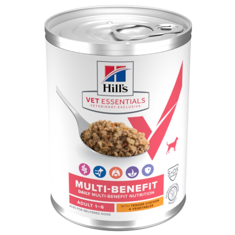 Hill's Vet Essentials Multi-Benefit Adult s křehkým kuřetem a zeleninou je kompletní víceúčelové krmivo pro dospělé psy ve věku 1–6 let. Konzerva poskytuje všestranně prospěšnou výživu s klinicky ověřenými přínosy. Bez umělých konzervantů, syntetických barviv a umělých příchutí.