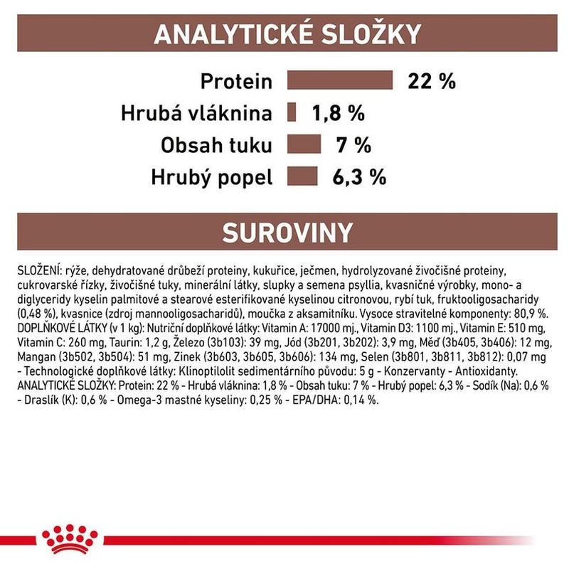 Hrubý protein 22,0 %, hrubý tuk 7,0 %, hrubá vláknina 1,8 %, hrubý popel 6,3 %, sodík 0,6 %, draslík 0,6 %, omega-3 mastné kyseliny 0,25 %, EPA/DHA 0,14 %.
