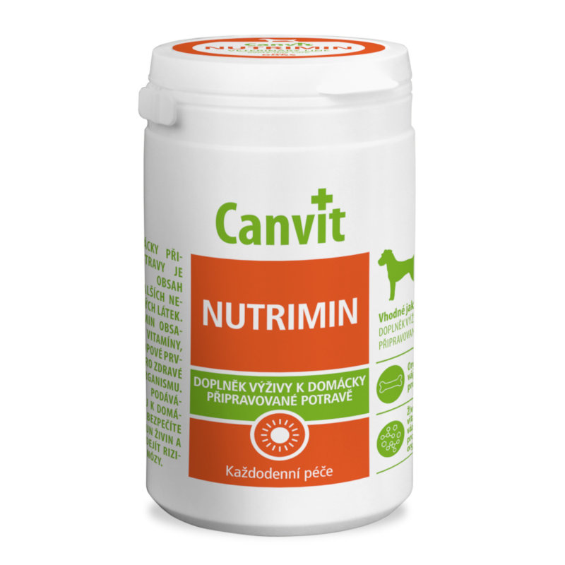 Canvit Nutrimin je doplněk výživy k domácky připravované potravě. Rizikem domácky připravované stravy je nevyrovnaný obsah vitaminů a dalších nepostradatelných látek. Canvit Nutrimin obsahuje veškeré vitaminy, minerály a stopové prvky nezbytné pro zdravé fungování organismu. Pravidelným podáváním přípravku k domácímu jídlu zabezpečíte bezpečný přísun živin a pomůžete předejít riziko hypovitaminózy.