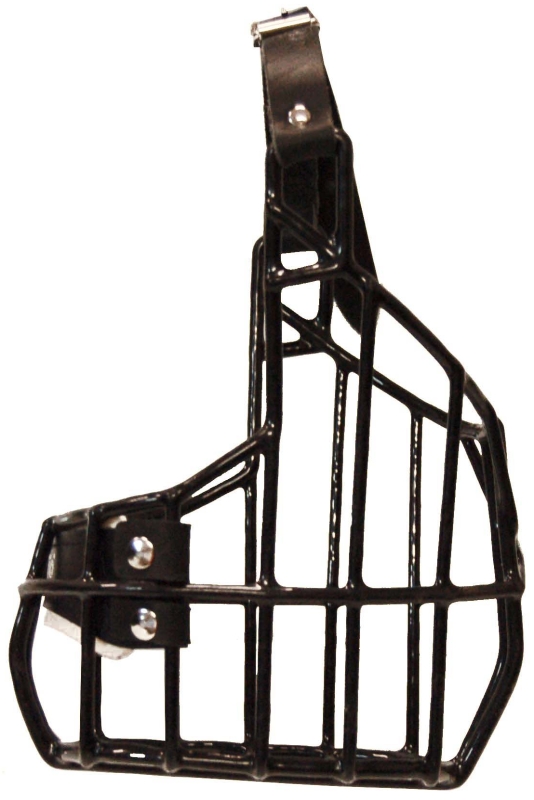 Kovový náhubek s koženými řemínky na zapínání.
