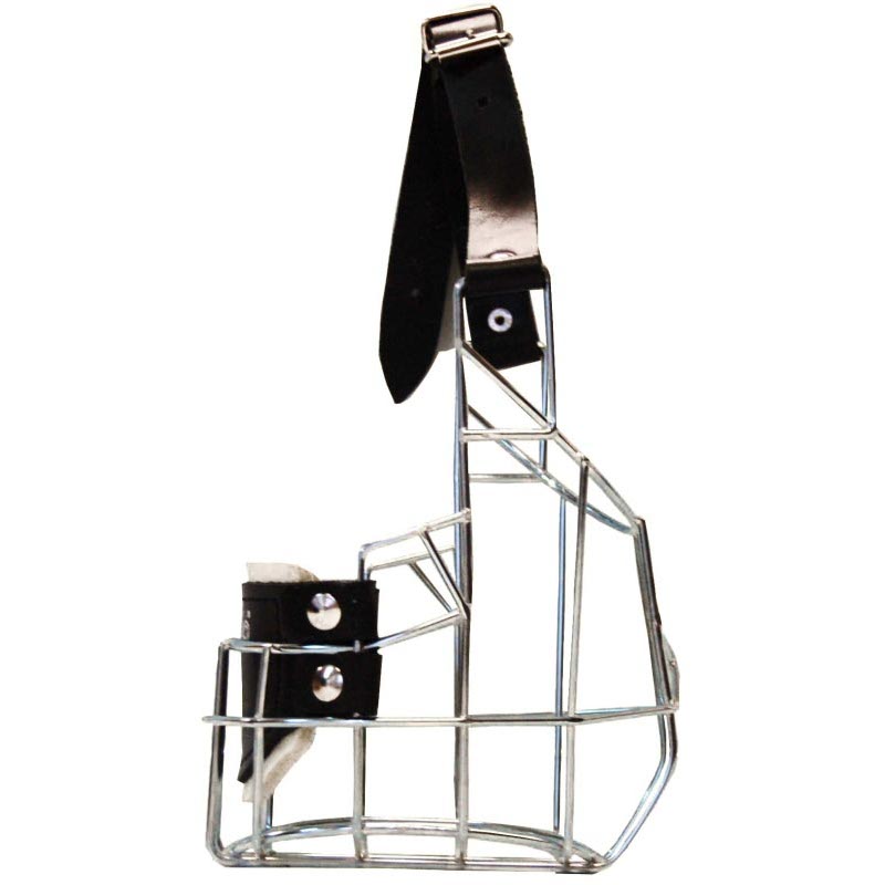 Kovový náhubek s koženými řemínky na zapínání.