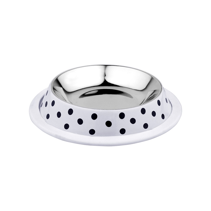 Miska Duvoplus Deco Fix na krmivo nebo vodu pro kočky a malé psy je vyrobena z broušené nerezové oceli. Spodní okraj má gumový lem, aby miska na podlaze neklouzala a nedělala hluk. Stylový vzhled jí dodává moderní potisk s puntíky. Vhodná pouze pro ruční mytí.