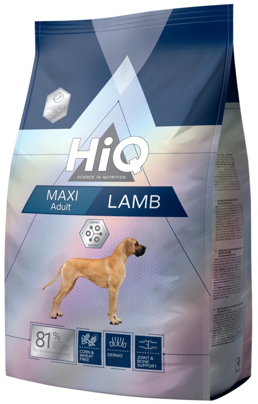 Kompletní krmivo HiQ pro dospělé psy velkých plemen je vhodné pro psy nad 25 kg váhy. Obsahuje bílkoviny z jehněčího masa, které vyhovují potřebám organismu a udržují správnou energetickou rovnováhu. Neobsahuje pšenici a kukuřici, proto je vhodné pro psy s citlivým zažíváním nebo trpící nesnášenlivostí lepku. Krmivo napomáhá snadnému trávení a vstřebávání živin. Podporuje zdraví kostí a kloubů a dodává potřebné vitamíny a minerály. Pečuje o správné fungování srdeční činnosti a také o imunitu psa.