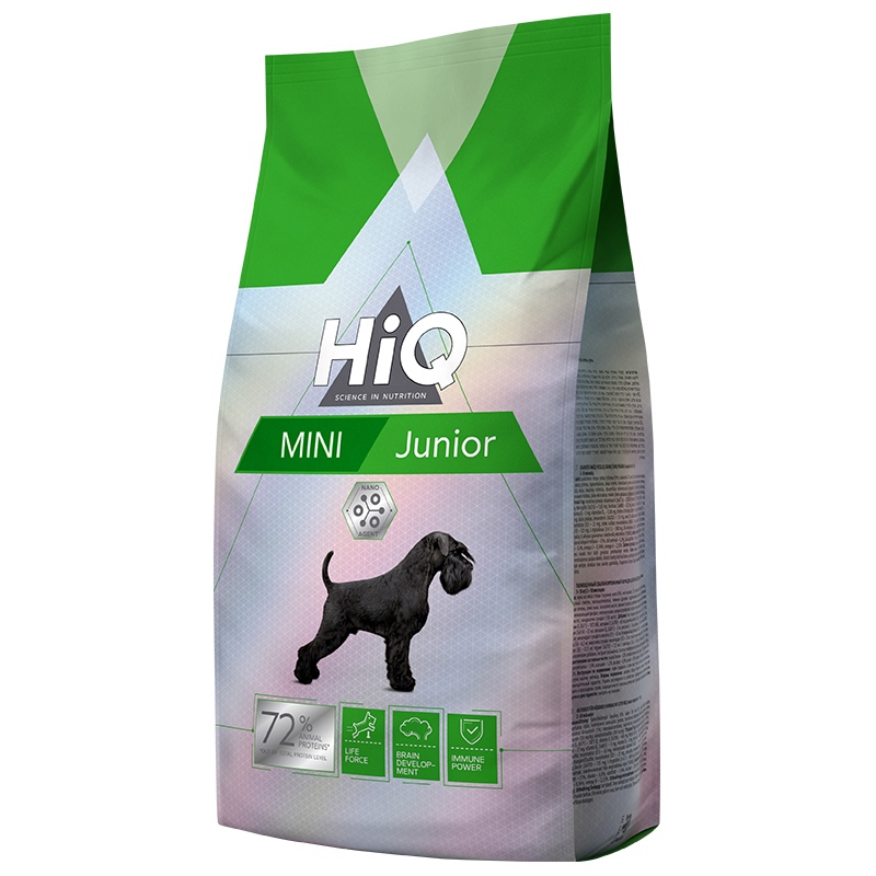 Kompletní krmivo HiQ pro štěňata a rostoucí mladé psy malých plemen je vhodné pro psy ve věku od 2 do 18 měsíců. Hlavním zdrojem bílkovin je kuřecí maso. Komponenty krmiva plně vyhovují potřebám organismu a udržují správnou energetickou rovnováhu. Krmivo podporuje zdraví kostí a kloubů a dodává potřebné vitamíny a minerály. Zároveň podporuje správné fungování srdeční činnosti a pečuje o imunitu psa. Komponenty krmiva napomáhají zachovat lesk a hustotu srsti, podporují zdraví pokožky.