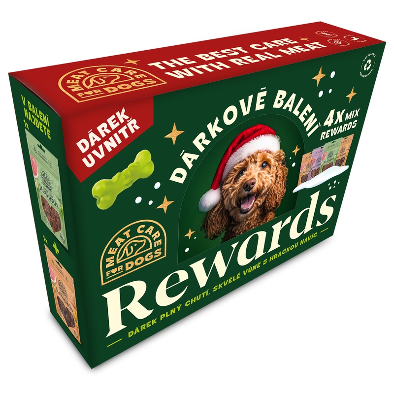 Všichni majitelé psů zbystřete! Dárkové balení Rewards obsahuje v recyklovatelném boxu čtveřici sáčků s voňavými pamlsky a jako bonus odolnou hračku z TPR materiálu, kterou lze naplnit dobrotami.