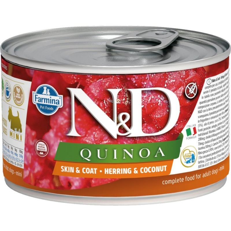 Farmina N&D Quinoa Herring & Coconut je krmivo pro zvláštní účely výživy určené k podpoře omezení intolerance určitých komponentů a živin.