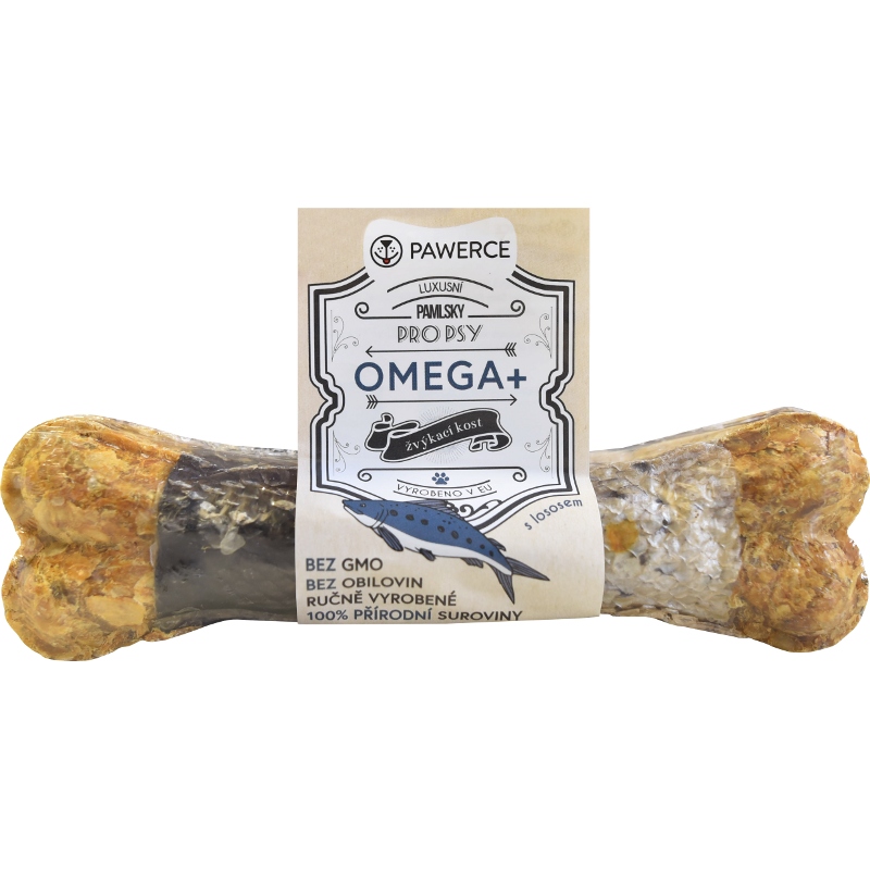 Základ těchto delikátních pamlsků tvoří vysoce kvalitní vnitřní část hovězí kůže, doplněná špenátem a kurkumou a obalená kůží z lososa. Omega kost obsahuje maso a kůži z lososa, které představují vynikající zdroj mastných kyselin. Špenát a kurkuma působí protizánětlivě a pomáhají snižovat riziko vzniku srdečních onemocnění. Navíc zdravé žvýkání zabaví vašeho psa na dlouhou dobu.