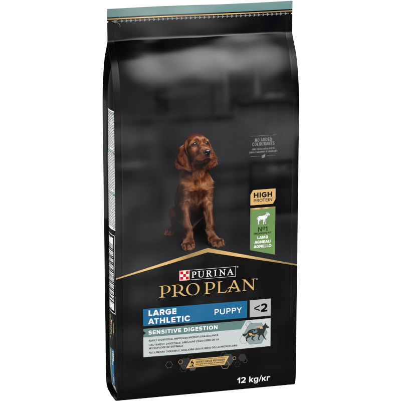 Krmivo Purina PRO PLAN® Sensitive Digestion LARGE PUPPY ATHLETIC bylo vyvinuto pro štěňata velkých sportovních plemen (s hmotností v dospělosti nad 25 kg). Granule pro štěňata obsahují vitamín D a minerální látky, které podporují silné a zdravé zuby. Krmivo má velký podíl vysoce kvalitního jehněčího, a tak zajišťuje optimální výživu štěňat velkých psů. To vše až do věku 24 měsíců, kdy přejdou na produkty řady ADULT.