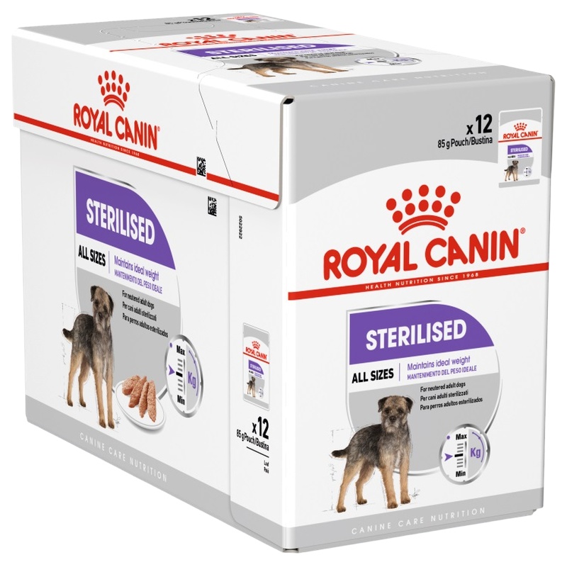 Kapsičky Royal Canin Sterilised jsou určené pro kastrované dospělé psy všech plemen a velikostí od 10 měsíců věku a jsou vhodné také pro psy se sklonem k nadváze. Kompletní krmivo ve formě chutné paštiky pomáhá zamezit nárůstu hmotnosti psa.
