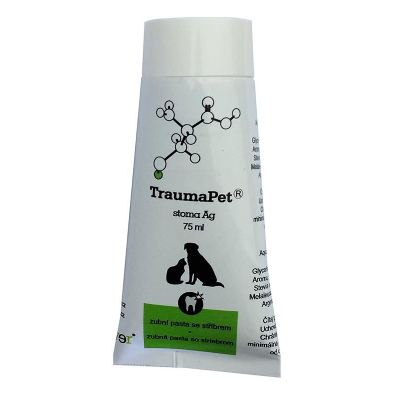 TraumaPet stoma Ag je veterinární přípravek pro čištění zubů s obsahem nanostříbra. Dlouholeté výzkumy a konkrétní aplikace prokázaly antimikrobní a protizánětlivé účinky stříbra.