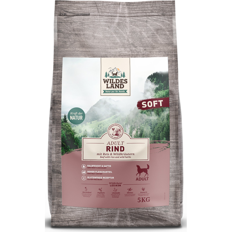 Polovlhké granule Wildes Land Soft jsou vhodné pro dospělé psy všech plemen, kterým poskytují v souladu s nejnovějšími vědeckými poznatky všechny důležité živiny a vitamíny, potřebné pro dlouhý a aktivní život. Mají vysoký obsah hovězího masa, které je zároveň jediným zdrojem živočišných bílkovin. Jako zdroje sacharidů slouží lehce stravitelná bezlepková rýže a brambory. Jde tudíž o ideální krmivo pro psy s citlivým zažíváním. Vysoký podíl čerstvého masa, zbytková vlhkost (18 %) a bylinky zvyšují chutnost krmiva.
