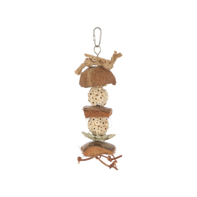 Přírodní závěsná hračka z kokosových skořápek, dřeva sola, palmového listí, kokosových vláken a jutového provazu je vhodná pro různé druhy papoušků. Podporuje mentální aktivitu a přirozenou péči o zobák. Díky kovové karabince ji lze snadno zavěsit do klece nebo voliéry. Použité materiály jsou bezpečné a přizpůsobené potřebám papoušků.