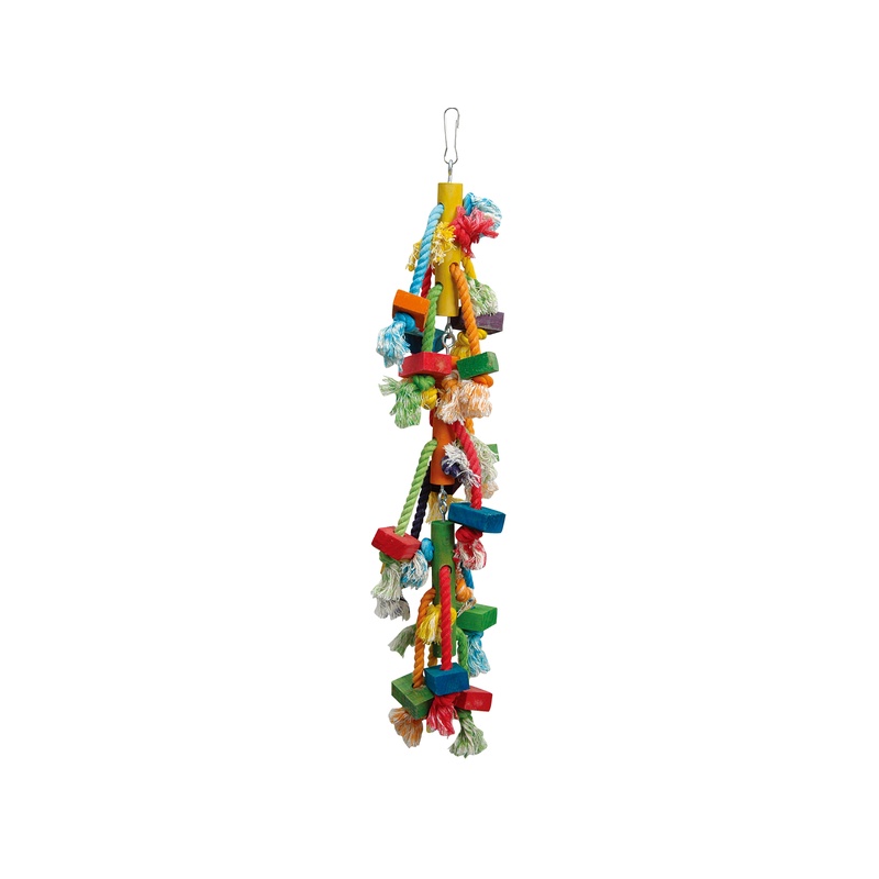 Závěsná hračka se zauzlovanými provazy a různorodými texturami je vhodná pro malé, střední i velké papoušky. Podporuje přirozené šplhání a zkoumání. Díky uzlům, dřevěným částem a nápaditému provedení udržuje papouška v dobré fyzické i mentální kondici. Barevné zpracování stimuluje smysly. Bezpečná kovová karabinka umožňuje snadné zavěšení do jakékoli klece. Hračka je vyrobena z netoxických a pro papoušky bezpečných materiálů.