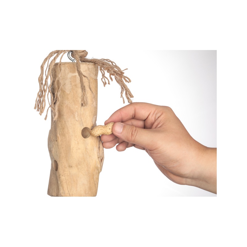 Závěsná plnitelná hračka z extra pevného dřeva kávovníku je vhodná pro různé druhy papoušků. Do otvorů ve dřevě lze ukrýt pamlsky a podpořit tak přirozené hledání potravy, zkoumání a ozobávání. Hračka tak stimuluje psychickou i fyzickou aktivitu. Díky nerezovému řetízku s kovovou karabinkou ji lze snadno zavěsit do klece nebo voliéry. Vyrobena z přírodních a bezpečných materiálů.