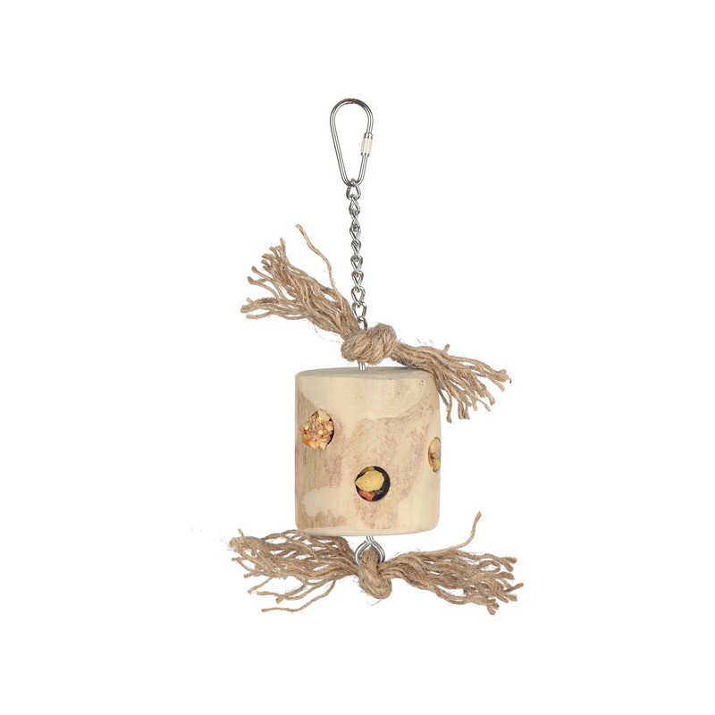 Závěsná hračka z extra pevného dřeva kávovníku je vhodná pro malé papoušky. Do otvorů ve dřevě lze ukrýt pamlsky a podpořit tak přirozené hledání potravy, zkoumání a ozobávání. Hračka stimuluje psychickou i fyzickou aktivitu. Díky nerezovému řetízku s kovovou karbinkou ji lze snadno zavěsit do klece nebo voliéry. Vyrobena z přírodních a bezpečných materiálů.