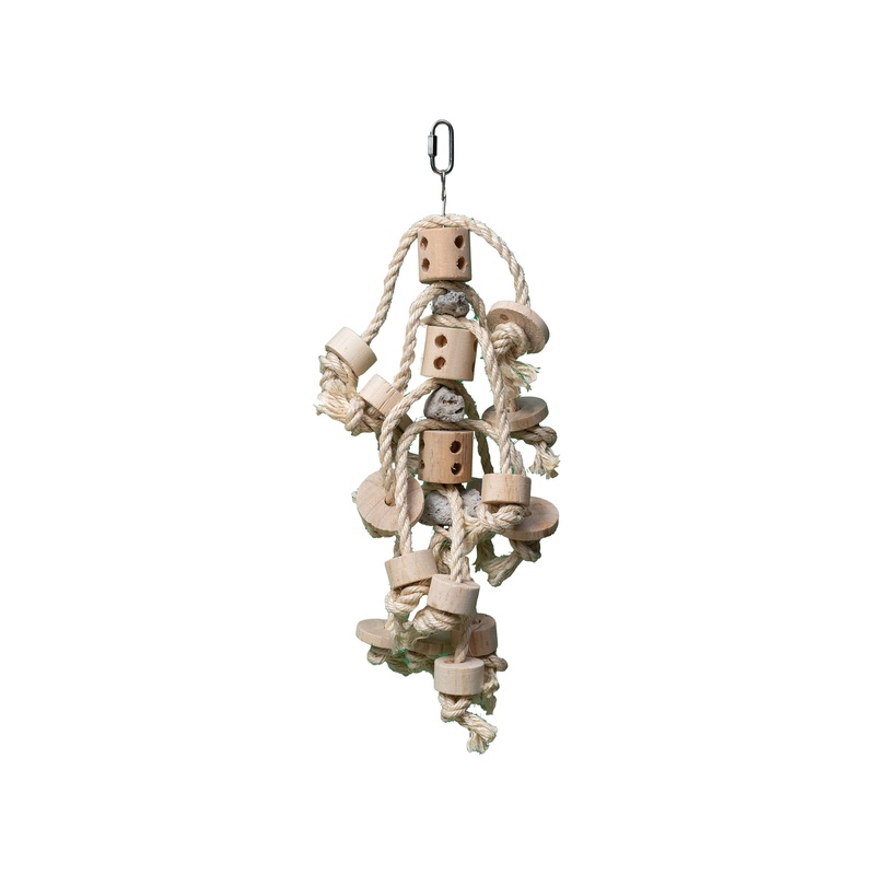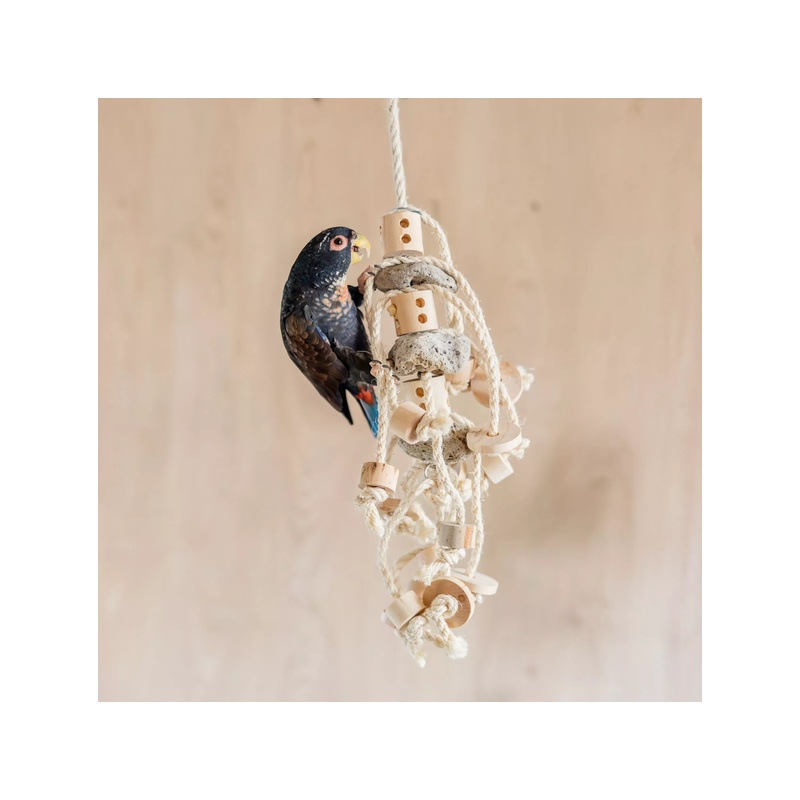 Závěsná hračka z borovicového dřeva, lávového kamene a sisalového provazu je vhodná pro malé až středně velké papoušky. Podporuje šplhání, ozobávání a zkoumání. Nabízí rozmanité podněty a představuje výzvu pro aktivní ptáky. Díky kovové karabince ji lze snadno zavěsit do klece nebo voliéry. Vyrobena z přírodních a bezpečných materiálů.