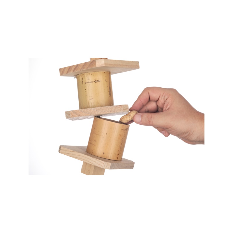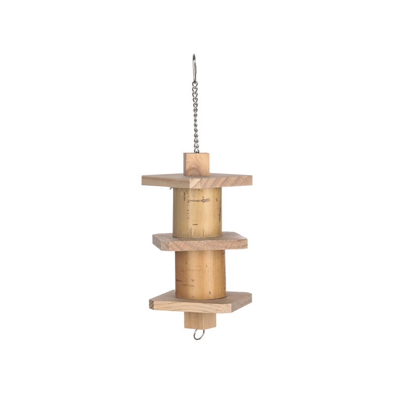 Závěsná hračka z borovicového dřeva a bambusu je vhodná pro různé druhy papoušků. Do otvorů ve dřevě lze ukrýt pamlsky a podpořit tak přirozené hledání potravy, ozobávání a zkoumání. Hračka stimuluje mentální i fyzickou aktivitu a pomáhá zahnat nudu. Díky nerezovému řetízku s kovovou karabinkou ji lze snadno zavěsit do klece nebo voliéry. Vyrobena z odolných a bezpečných materiálů.