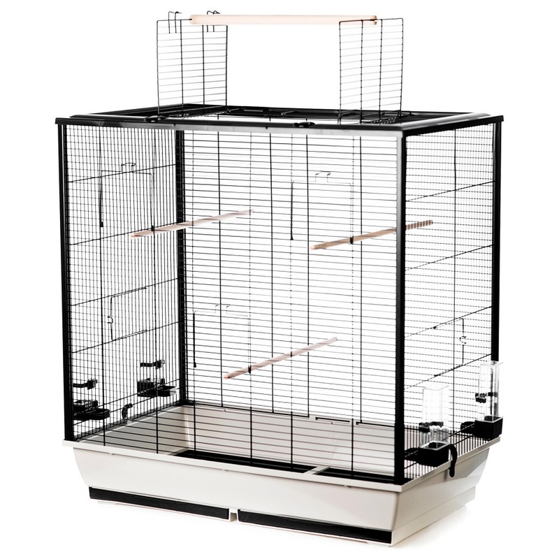 Odlehčená a rozebíratelná klec Fiona s plastovým rámem je určená pro středně velké papoušky. Dno klece má dva výsuvné šuplíky pro pohodlnější čištění. Součástí klece je základní vybavení: 3 dřevěná bidýlka, horní bidlo a 4 krmítka/napáječky. Na bocích klece je umístěno celkem 5 dvířek pro snadný přístup. Stropní dvířka lze otevřít a vsadit do nich bidlo, aby měl papoušek větší volnost pohybu a rozhled, a přitom neznečišťoval domácnost.