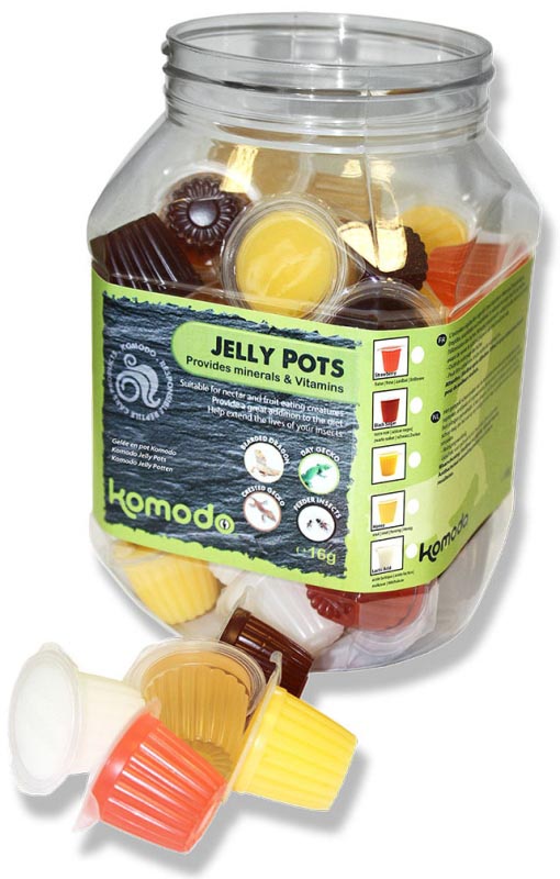 Komodo Jelly kalíšky s gelovým krmivem různých příchutí (jahoda, med, banán, mango atd.) jsou ideální jako doplňková výživa pro krmný hmyz, který díky nim zůstane v dobré kondici a bude pro vašeho plaza či obojživelníka hodnotnější potravou. Jako příležitostný pamlsek je lze podávat také terarijním živočichům (od brouků a mnohonožek až po gekony a agamy), jejichž běžná strava zahrnuje ovoce či nektar.
