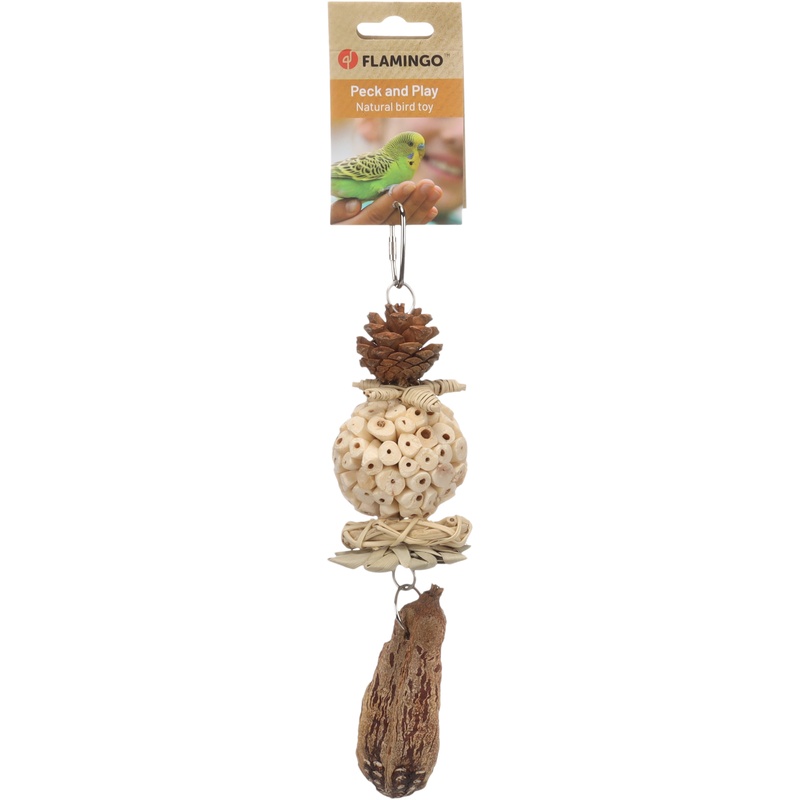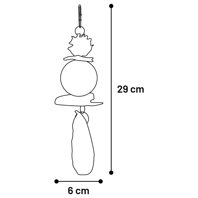 Přírodní závěsná hračka ze dřeva sola, palmových listů, mahagonového lusku, ratanu a borové šišky je vhodná pro různé druhy papoušků. Podporuje mentální aktivitu a přirozenou péči o zobák. Díky kovovému závěsnému systému ji lze snadno zavěsit do klece nebo voliéry. Součástí hračky jsou míček, šiška, mahagonový lusk, kroužek a hvězdičky, které vybízejí k ozobávání. Použité materiály jsou přírodní a bezpečné pro papoušky.