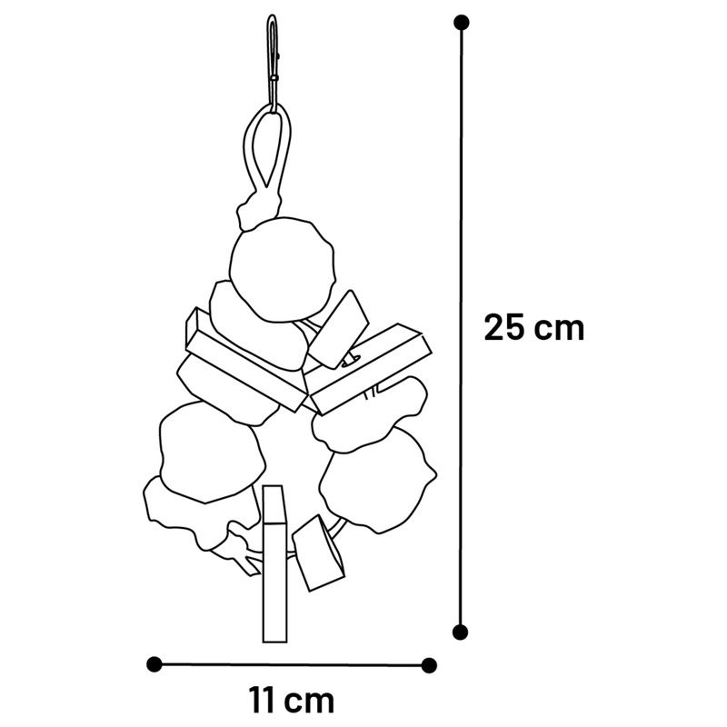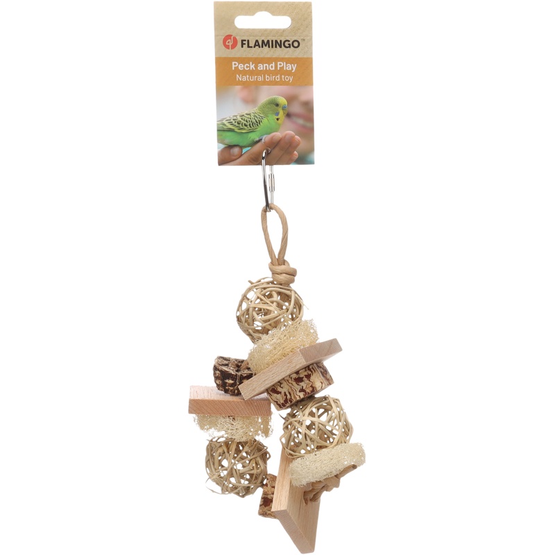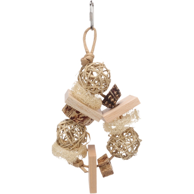 Přírodní závěsná hračka z lufy, borového dřeva, mahagonového lusku a ratanu je vhodná pro různé druhy papoušků. Podporuje mentální aktivitu a přirozenou péči o zobák. Díky kovovému závěsnému systému ji lze snadno zavěsit do klece nebo voliéry. Součástí hračky jsou míčky, lufa, mahagonový lusk a provázek, které vybízejí k ozobávání. Použité materiály jsou přírodní a bezpečné pro papoušky.