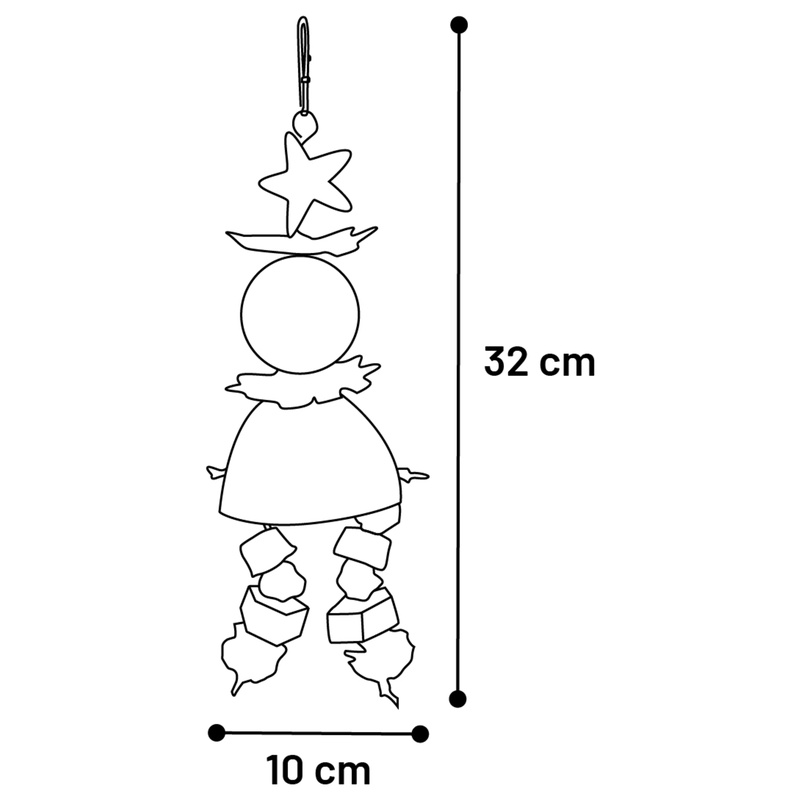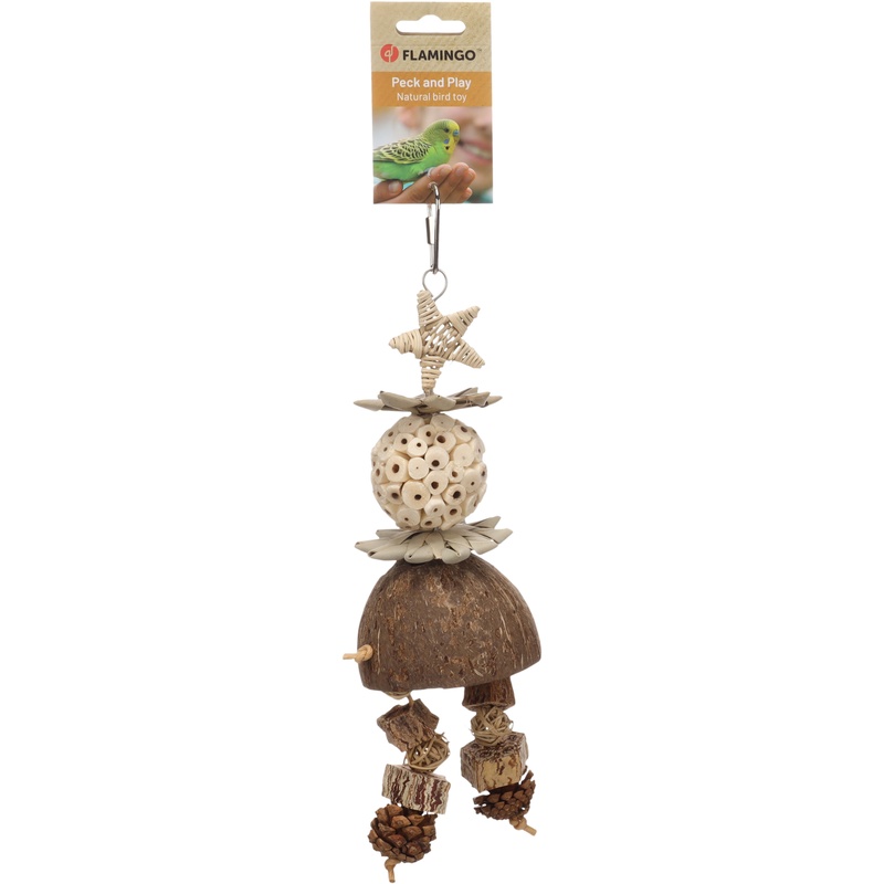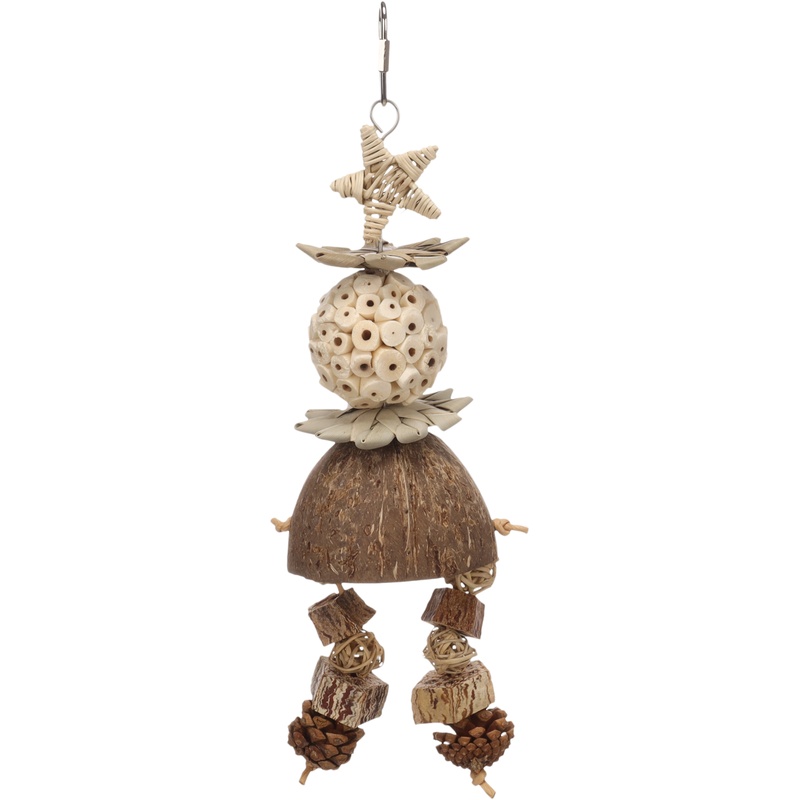 Přírodní závěsná hračka z kokosu, borových šišek, ratanu, palmových listů, mahagonového lusku a dřeva sola je vhodná pro různé druhy papoušků. Podporuje mentální aktivitu a přirozenou péči o zobák. Díky kovovému závěsnému systému ji lze snadno zavěsit do klece nebo voliéry. Součástí hračky jsou šišky, míček, kokos, mahagonový lusk, hvězdičky a provázky, které vybízejí k ozobávání. Použité materiály jsou přírodní a bezpečné pro papoušky.