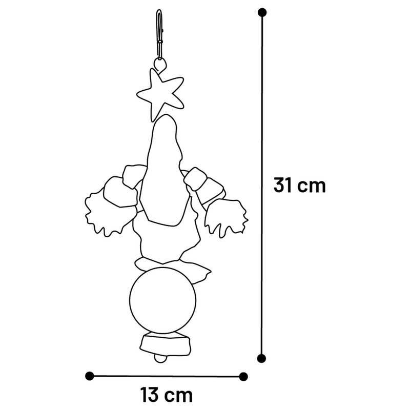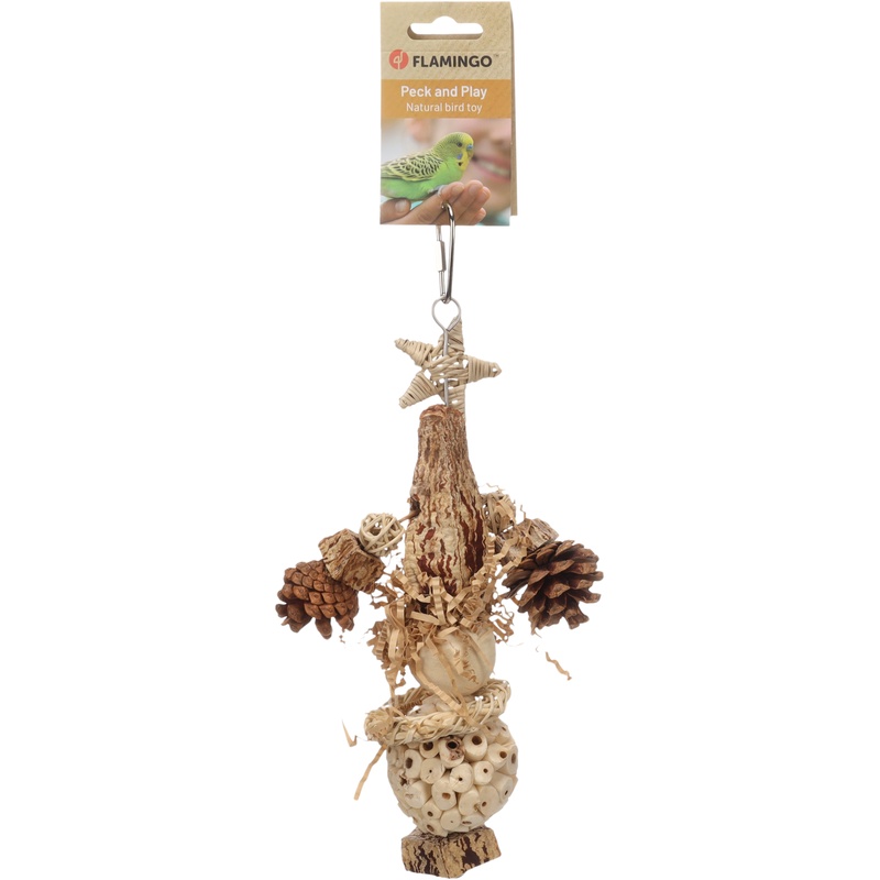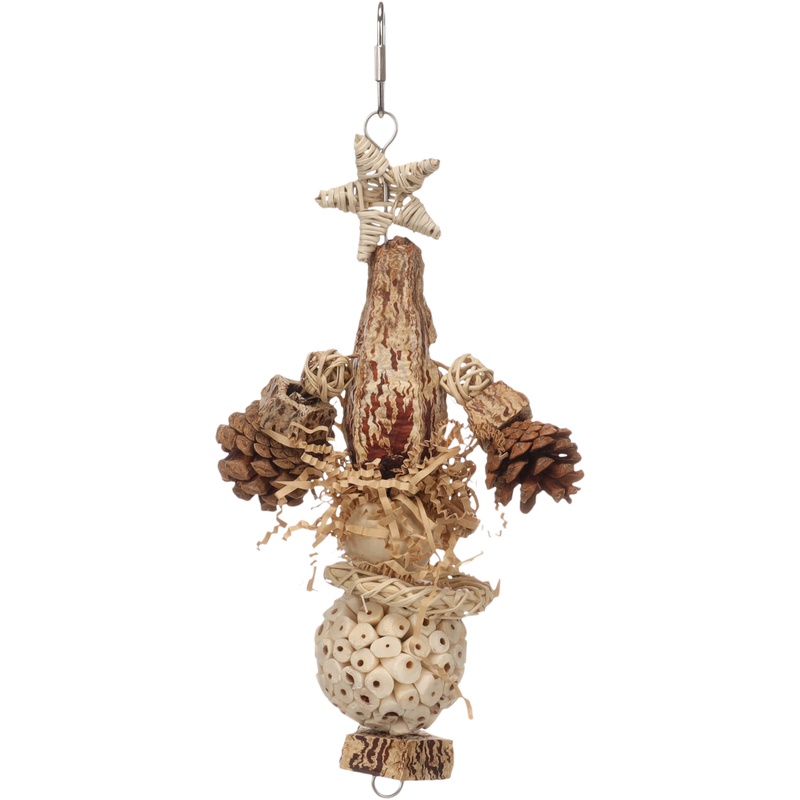 Přírodní závěsná hračka z mahagonového lusku, ratanu, dřeva sola, šišek, borového dřeva a papíru je vhodná pro různé druhy papoušků. Podporuje mentální aktivitu a přirozenou péči o zobák. Díky kovovému závěsnému systému ji lze snadno upevnit do klece nebo voliéry. Součástí hračky jsou provázky, korálek, míček, mahagonový lusk, hvězdička, kroužek a šišky, které vybízejí k ozobávání. Použité materiály jsou přírodní a bezpečné pro papoušky.