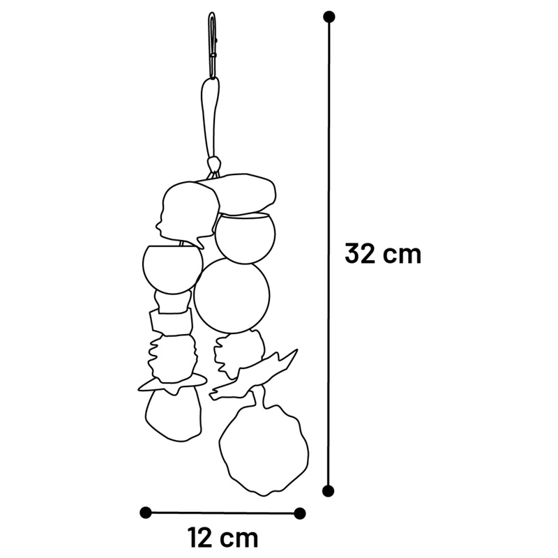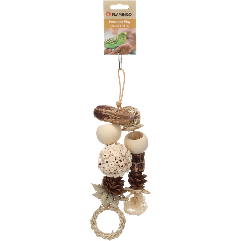 Přírodní závěsná hračka z mahagonového lusku, ratanu, šišek, dřeva sola, borového dřeva, lufy a palmových listů je vhodná pro různé druhy papoušků. Podporuje mentální aktivitu a přirozenou péči o zobák. Díky kovovému závěsnému systému ji lze snadno upevnit do klece nebo voliéry. Součástí hračky jsou korálky, míček, šišky, mahagonový lusk, hvězdičky, kroužek a lufa, které vybízejí k ozobávání. Použité materiály jsou přírodní a bezpečné pro papoušky.