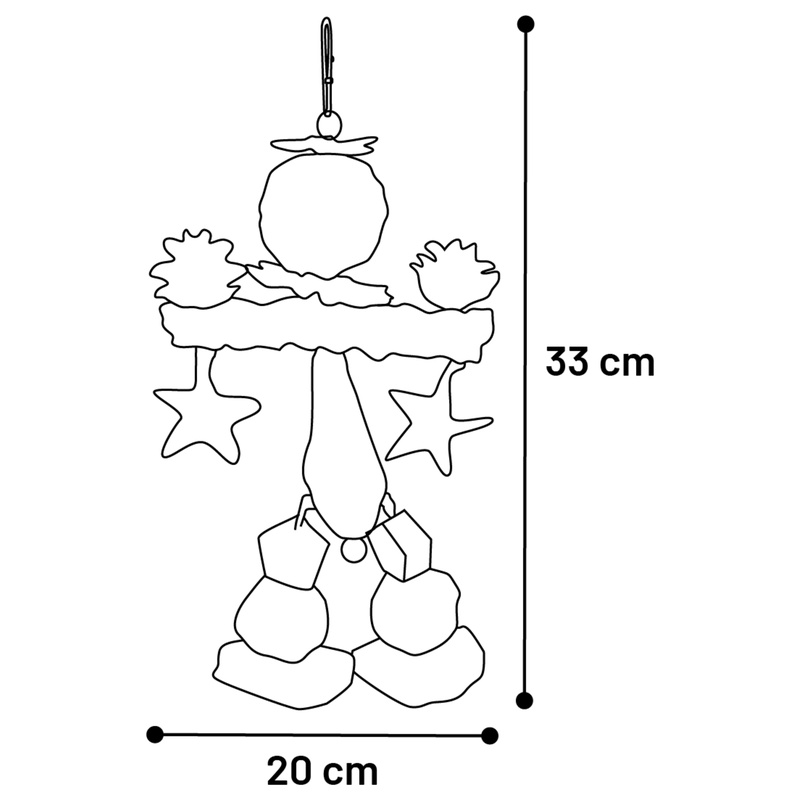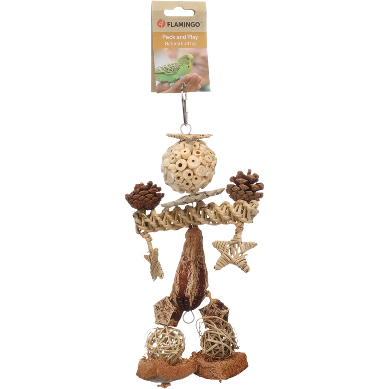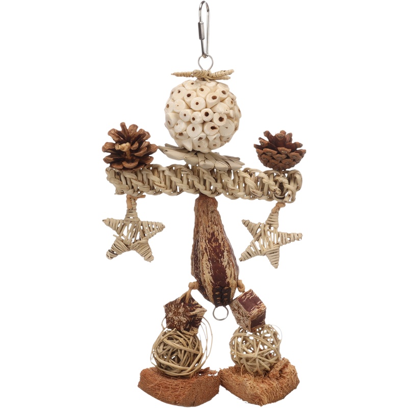 Přírodní závěsná hračka z ratanu, mahagonového lusku, kokosu, šišek, dřeva sola a palmových listů je vhodná pro různé druhy papoušků. Podporuje mentální aktivitu a přirozenou péči o zobák. Díky kovovému závěsnému systému ji lze snadno upevnit do klece nebo voliéry. Součástí hračky jsou míčky, hvězdičky, mahagonový lusk, spirála, kokos a šišky, které vybízejí k ozobávání. Použité materiály jsou přírodní a bezpečné pro papoušky.