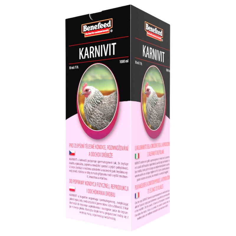 KARNIVIT obsahuje specifický komplex látek zlepšujících reprodukci drůbeže ve Vašem chovu. Všechny aktivní látky jsou ve formě, která zajistí maximální účinnost každé z nich.
