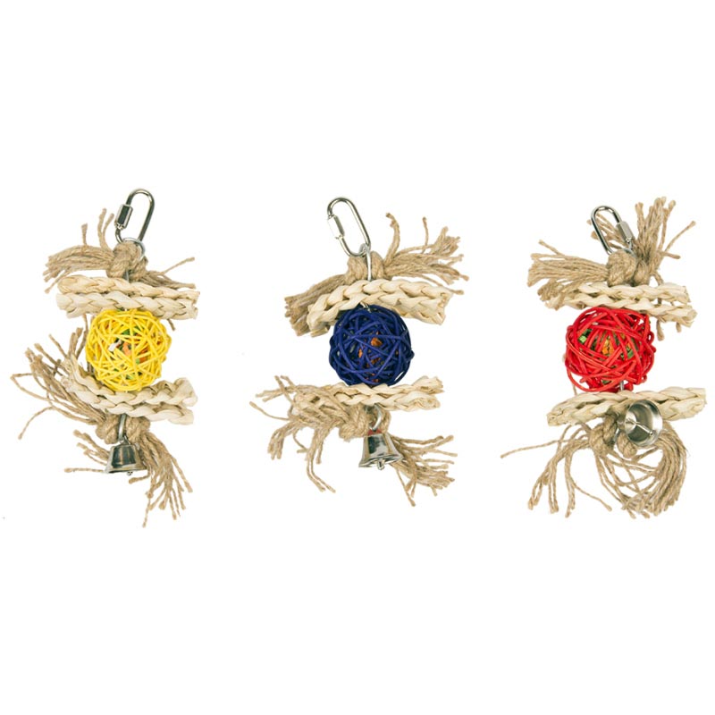Hračka z přírodních materiálů zpříjemní a obohatí ptákům prostředí v kleci.
