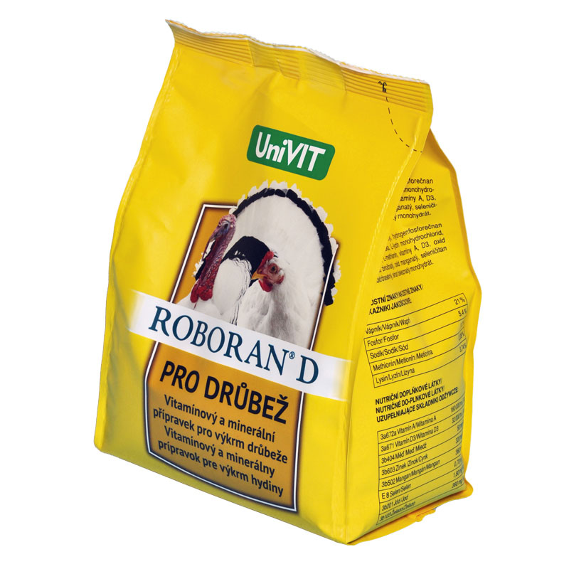 Roboran D je doplňkové vitamino-minerální krmivo pro drůbež, které se přidává do krmiva a doplňuje krmnou dávku o potřebné vitaminy, aminokyseliny metionin a lyzin, makrominerální a mikrominerální látky (Fe, Cu, Zn, Mn, J, Co, Mg, Se) a krmnou sůl v optimálních dávkách.